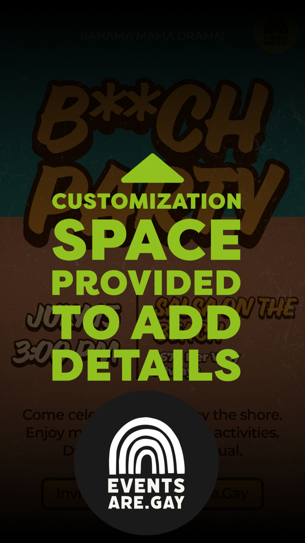 Proudly presented by EventsAre.Gay, this invitation is designed for those who love to celebrate life with humor and flair. Customize it to perfectly match your event's vibe and send out an invitation that's guaranteed to get everyone excited!